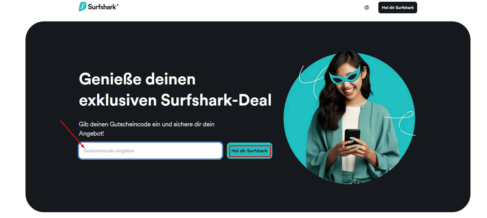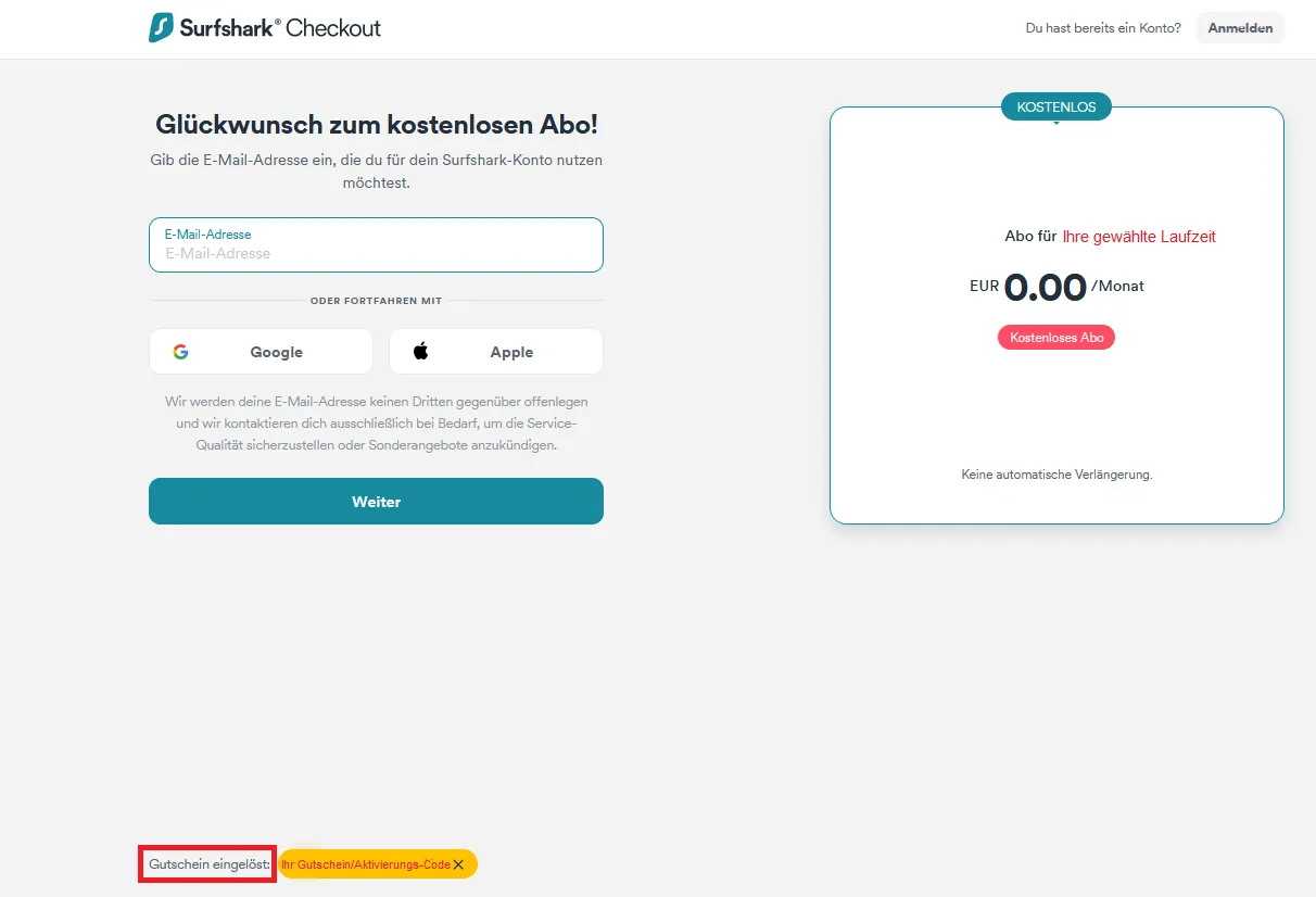 2.) „Kopieren und Einfügen“ Sie den Gutscheincode von der E-Mail in das Feld „Gutscheincode eingeben“ auf der unten genannten Aktivierungsseite von Surfshark.